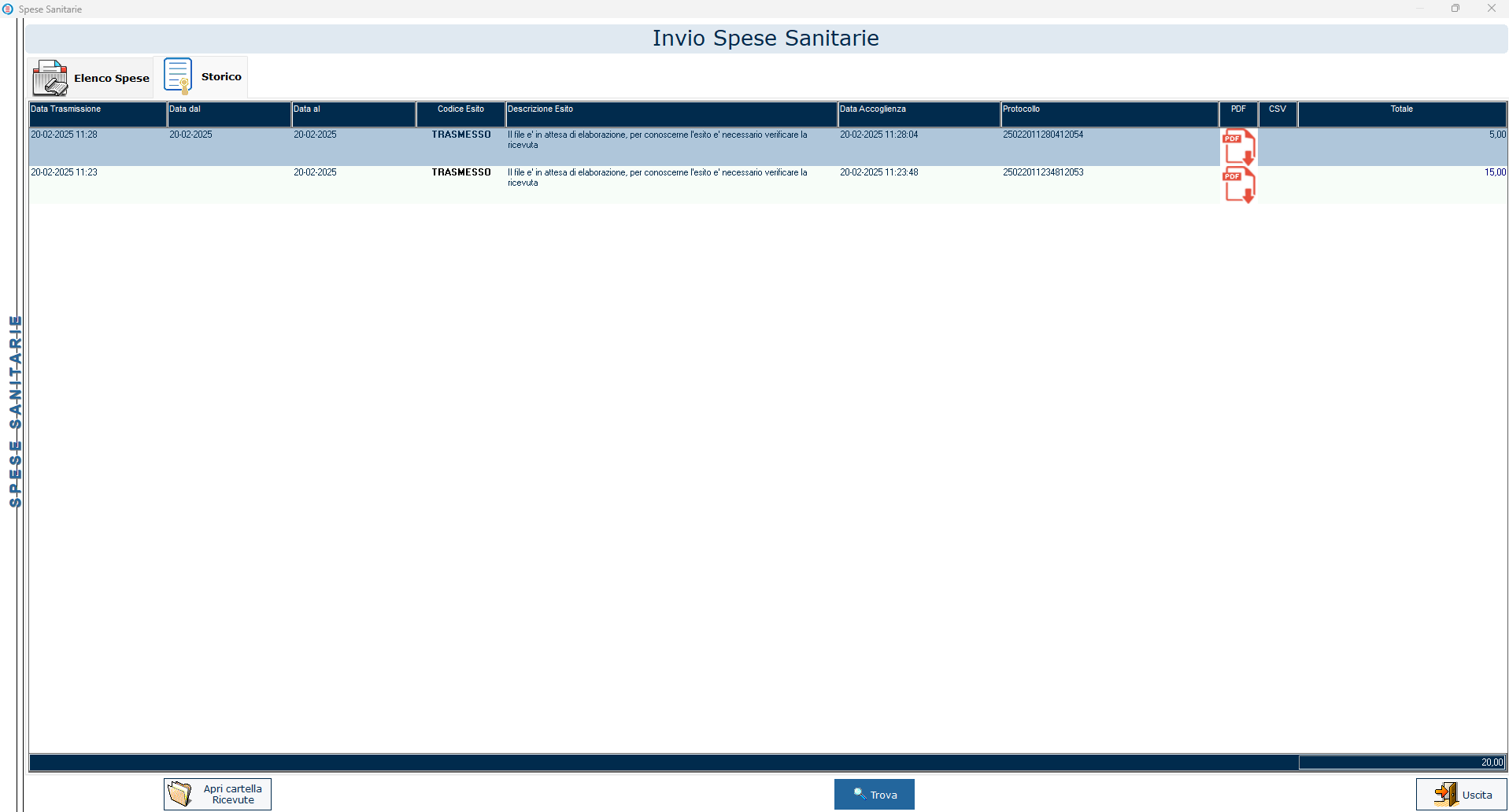 E’ possibile controllare lo stato di invio e scaricare direttamente le ricevute PDF della corretta trasmissione delle spese.